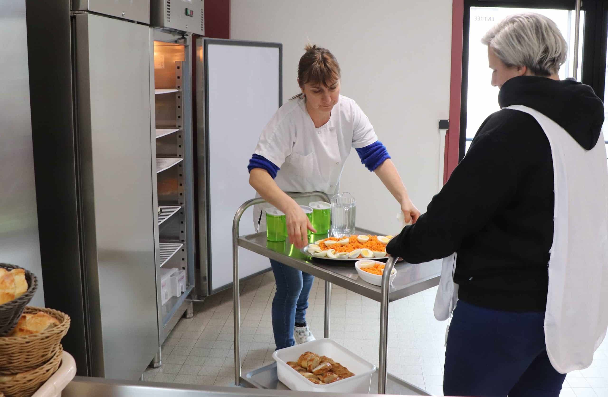 Le temps que les dames les installent, et voici les plus grands qui viennent occuper les tables – un peu plus hautes – de l’autre salle. Virginie est déjà retournée à la cuisine pour extraire des grands frigos en inox une impressionnante série de plats garnis de carottes râpées au thon encerclées d’une guirlande de rondelles d’œuf dur. Tout a été acheté frais, épluché, râpé, cuit, écalé, tranché le matin même. « Il n’y a que le thon qui est en boîte. On n’en a pas dans la Dore ! », plaisante Virginie en déposant les plats sur les tables roulantes.