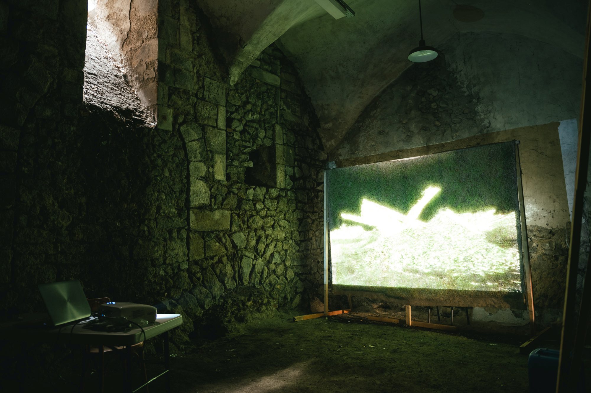 Prenons l’exemple de « Seeds of Anthropocene », réalisé au cours de diverses résidences en 2022-23, dont la dernière à l’Hôtel Fontfreyde. Le protocole qu’il a expérimenté était le suivant : prenez une grande toile de jute et faites germer des graines de cresson sur toute sa surface ; une fois les petites pousses bien développées et accrochées à la toile, tendez celle-ci à la verticale dans une pièce noire et projetez-y durant plusieurs jours une photo. Sur les parties les plus claires de la photo, donc les plus lumineuses en projection, les pousses auront activé leur processus de photosynthèse et développé différentes nuances de vert, alors que dans les parties sombres, elles sont restées quasiment blanches. En quelque sorte, c’est la végétation qui s’est chargée, très lentement, de « révéler » l’image sur la toile.