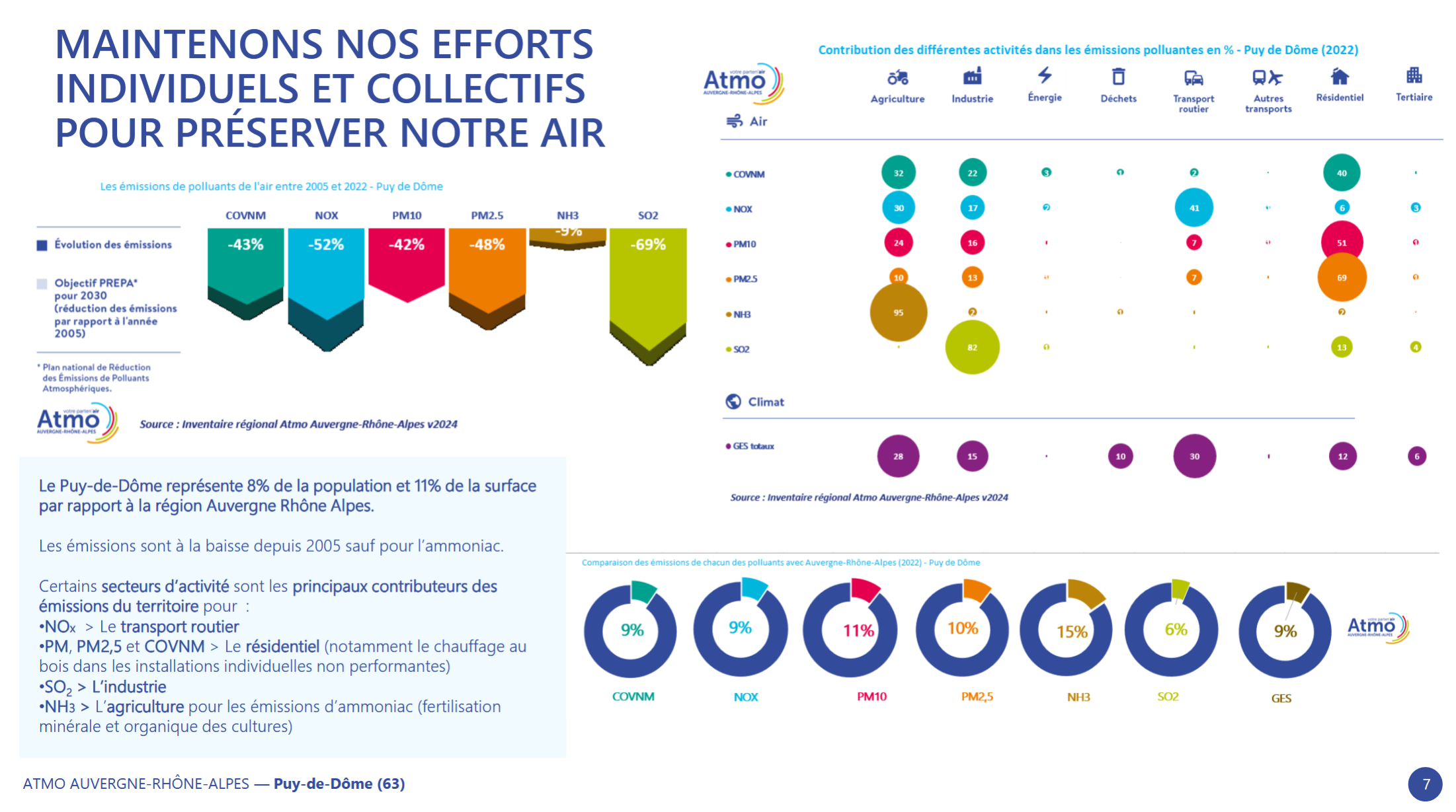 Dans celui du Puy-de-Dôme, consultable ici, on retrouve les indicateurs de jours de vigilance (seulement 2 en 2024, associés aux particules fines), mais surtout le détail des émissions y compris pour d’autres polluants, ainsi que des gaz à effet de serre, avec leur évolution depuis 2005 et les catégories de contributeurs.