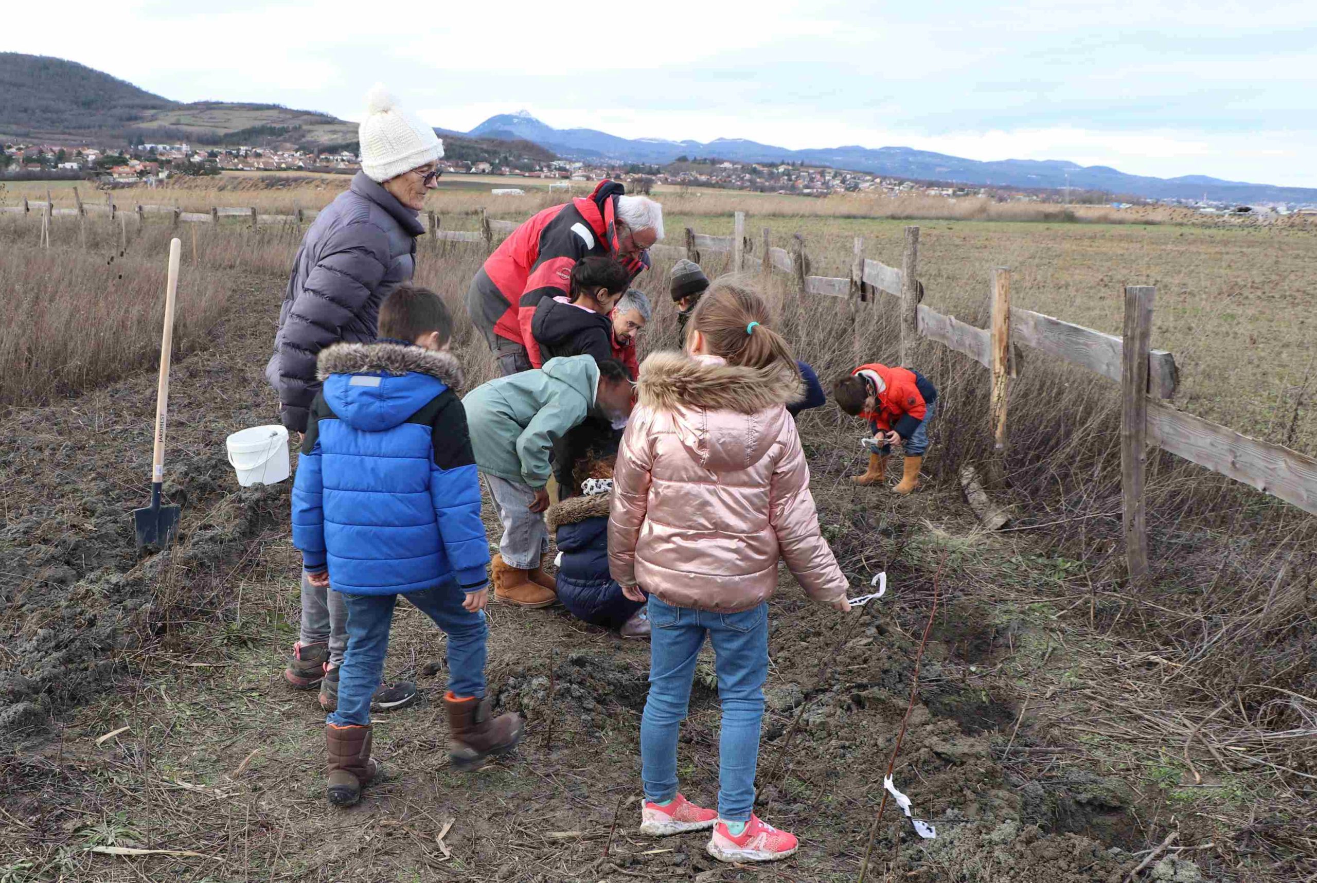 Reportage (texte et photos) Marie-Pierre Demarty, réalisé mardi 13 janvier 2026. Croquis Florine Corbara. À la une : au premier plan, un groupe d‘enfants sème son blé dans un petit coin de la ferme de Sarliève, tandis que l’autre groupe (au second plan) s’occupe à planter des arbres.