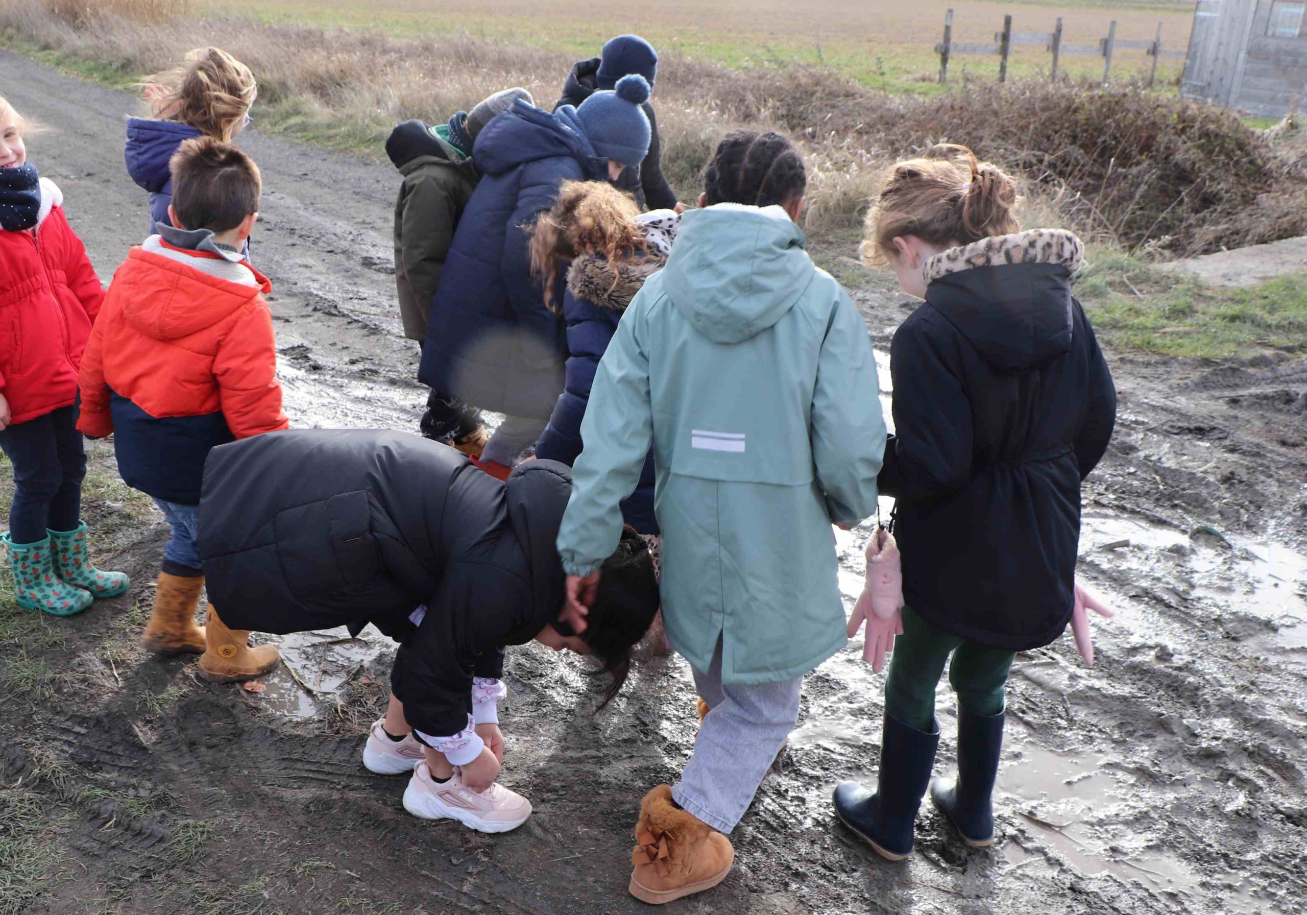 À la sortie du bus, ils ont chaussé leurs bottes. Les parents avaient pour consigne de leur fait porter des habits pas trop neufs. Ils ont de la chance : ce mardi, il fait beau et doux, presque 25°C de plus que la semaine précédente ! Le grand vent et la gadoue persistante n’allaient pas les arrêter, au contraire : quoi de plus réjouissant que de pouvoir patauger dans une flaque de boue, mettre les mains dans la terre et pour une fois, être autorisés à se salir ?