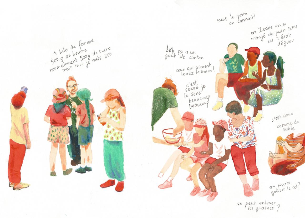 Parmi les étapes du parcours, il y a eu une rencontre avec Félix, le paysan-boulanger de la ferme de Sarliève ; une visite d’un autre établissement agricole, la ferme des Raux, qui combine la culture du blé, le travail de meunier et la fabrication du pain ; un apprentissage de la recette du pain ; une dégustation de pains de diverses origines, conviant les parents à faire découvrir leurs traditions issues de diverses régions du monde.
