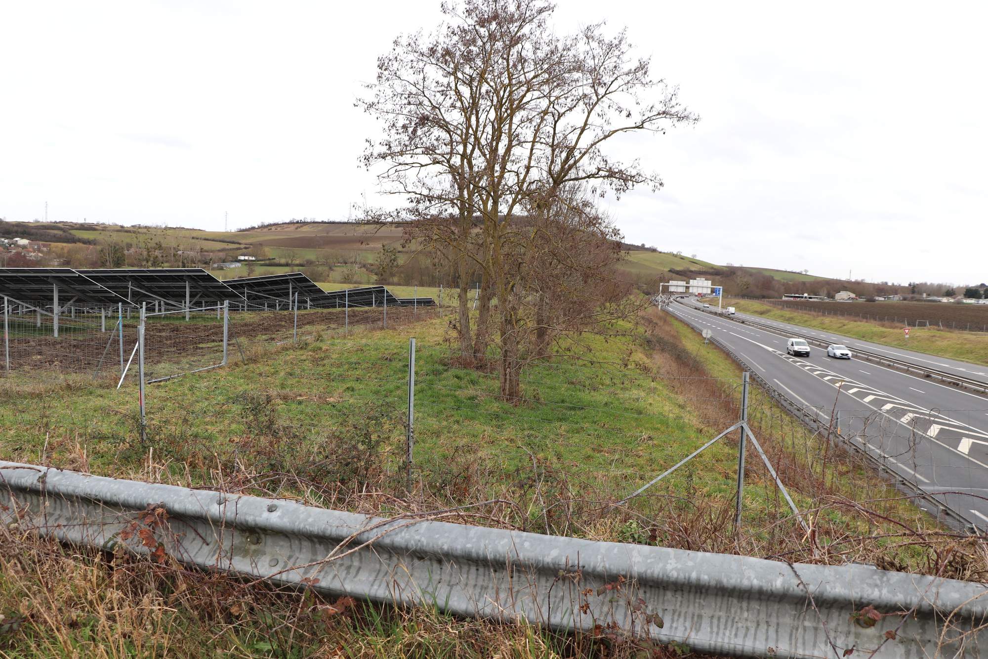 Le site en question : un bout de terrain en creux, derrière le talus qui borde l’autoroute. Remplissant le creux dans une relative discrétion, les panneaux photovoltaïques ont l’air d’avoir été disposés au petit bonheur, dans un alignement très imparfait. Frédéric Marillier, directeur d’Enercoop Auvergne-Rhône-Alpes, avait heureusement prévenu durant les discours : « Ils s’adaptent à la configuration du terrain. »