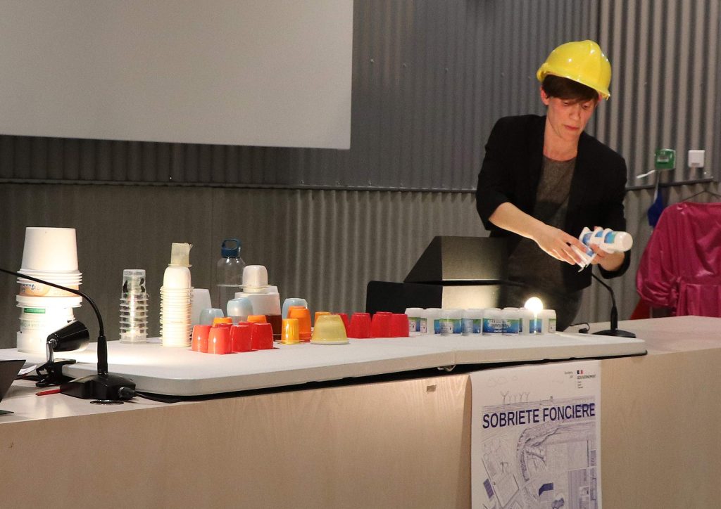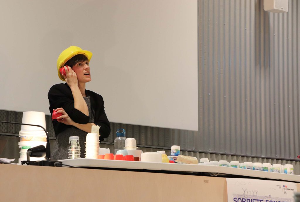 Les pots de yaourts, comme le masque, « c’est l’idée de mon metteur en scène, Pierre Yvon », précise Amandine. Mais c’est elle qui a écrit le spectacle, où elle balaie avec tant d’humour et avec une grande clarté toutes les problématiques rencontrées par son ancienne corporation, et tous les slogans qui ont accompagné les modes du développement urbain. On passe du temps de « la ville à la campagne, où tout le monde est heureux », à celui de l’étalement pavillonnaire, puis du « temps de la résilience » à grands renforts de « rénovation, réhabilitation, requalification, revalorisation » à la « création d’un nouveau métier : le manager de centre-ville », et ainsi de suite.