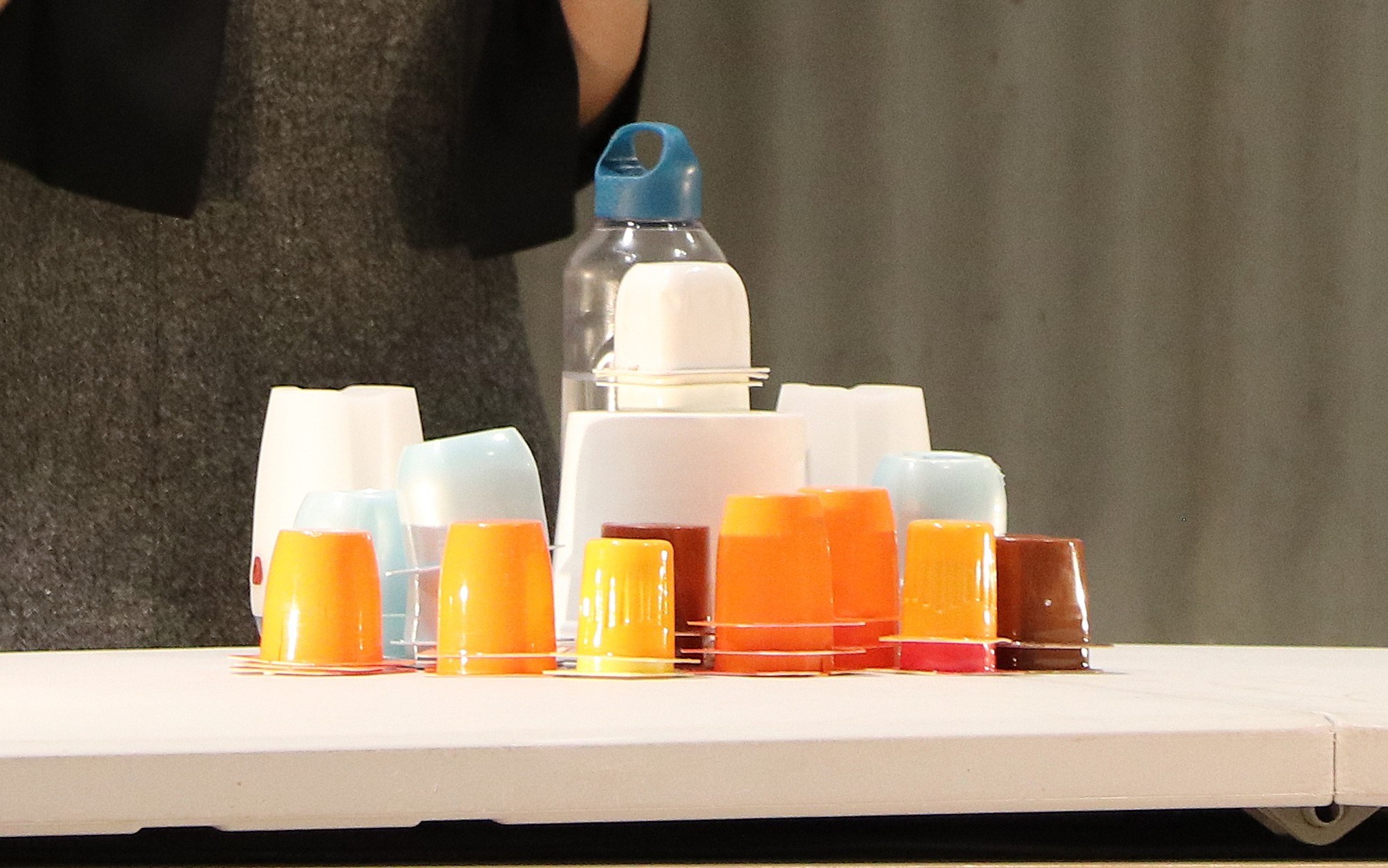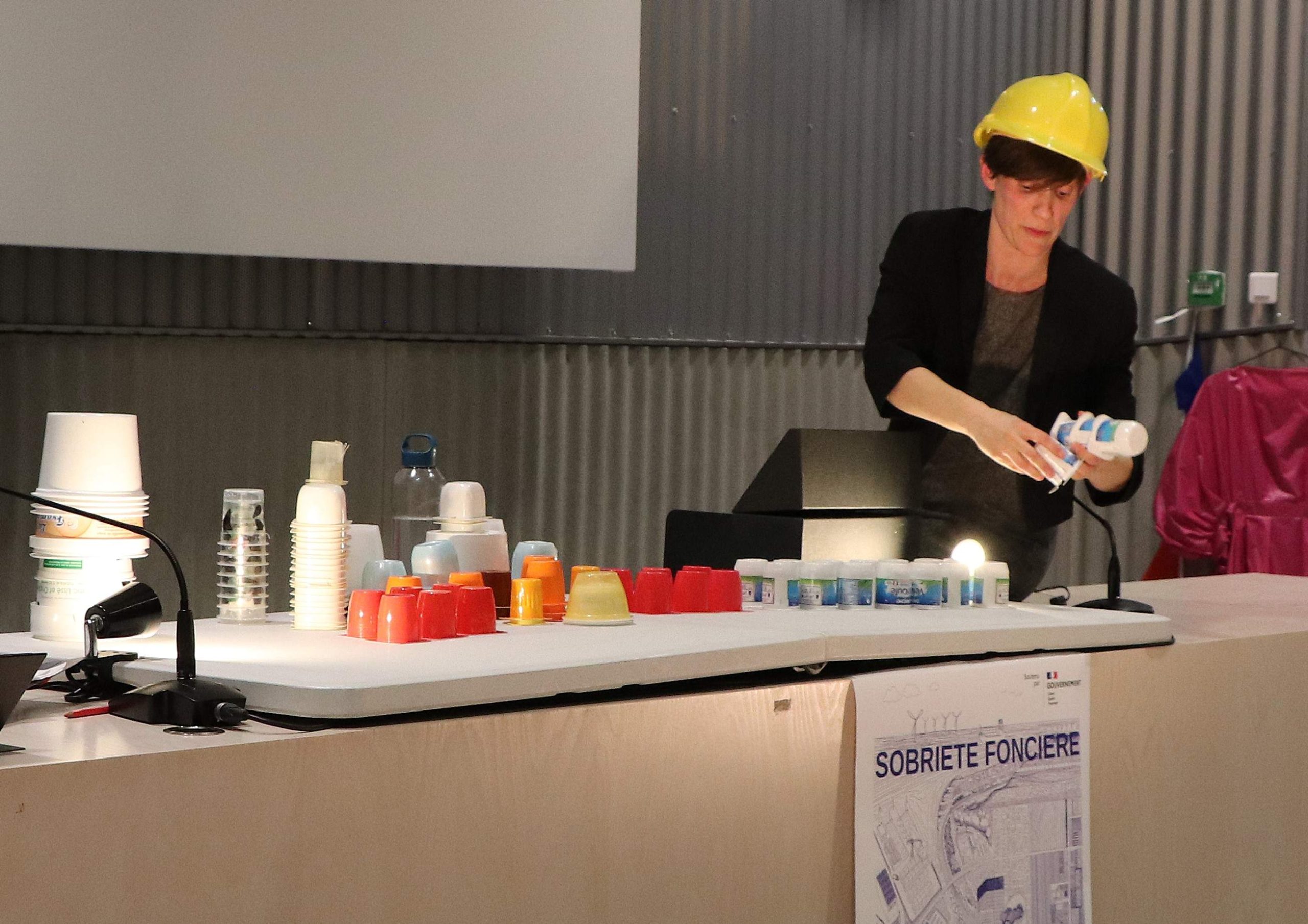 Chicon-la-Vallée est encore un assortiment de pots de yaourt figurant une maquette évolutive et très didactique : petits suisses colorés pour le centre-ville, yaourts nature uniformes pour les alignements de pavillons, gros pots de fromage blanc pour les supermarchés. Et cette gourde au milieu de l’agglomération ? « Ça, c’est l’église », précise la comédienne en la replaçant au centre après s’être permis une rasade d’eau au milieu du spectacle.