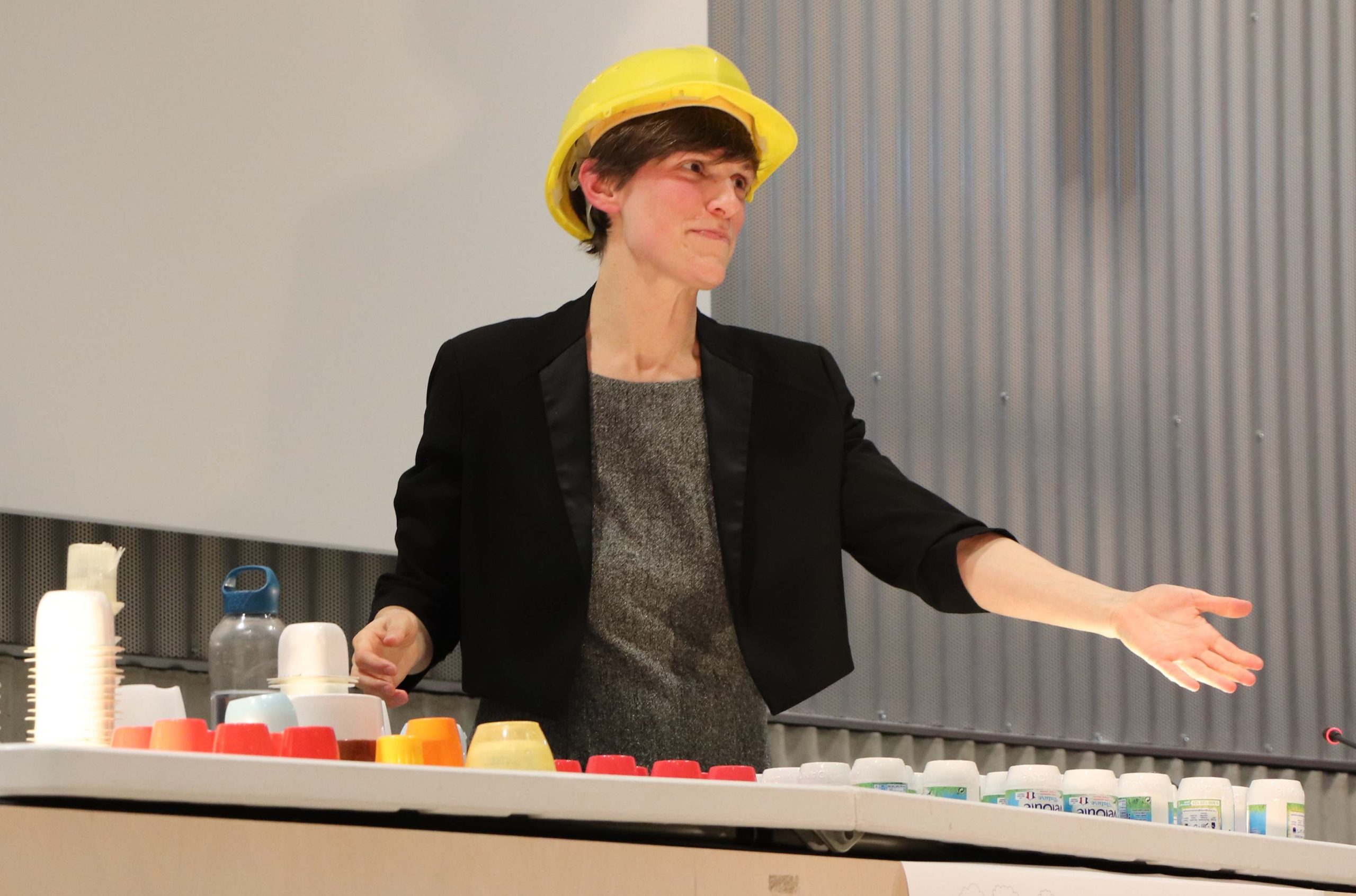Les pots de yaourts, comme le masque, « c’est l’idée de mon metteur en scène, Pierre Yvon », précise Amandine. Mais c’est elle qui a écrit le spectacle, où elle balaie avec tant d’humour et avec une grande clarté toutes les problématiques rencontrées par son ancienne corporation, et tous les slogans qui ont accompagné les modes du développement urbain. On passe du temps de « la ville à la campagne, où tout le monde est heureux », à celui de l’étalement pavillonnaire, puis du « temps de la résilience » à grands renforts de « rénovation, réhabilitation, requalification, revalorisation » à la « création d’un nouveau métier : le manager de centre-ville », et ainsi de suite.