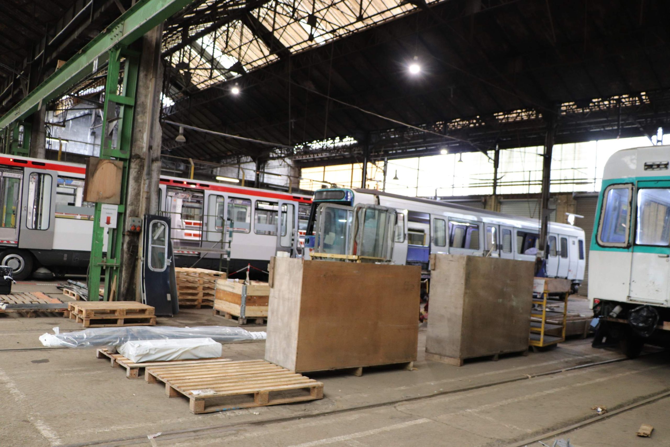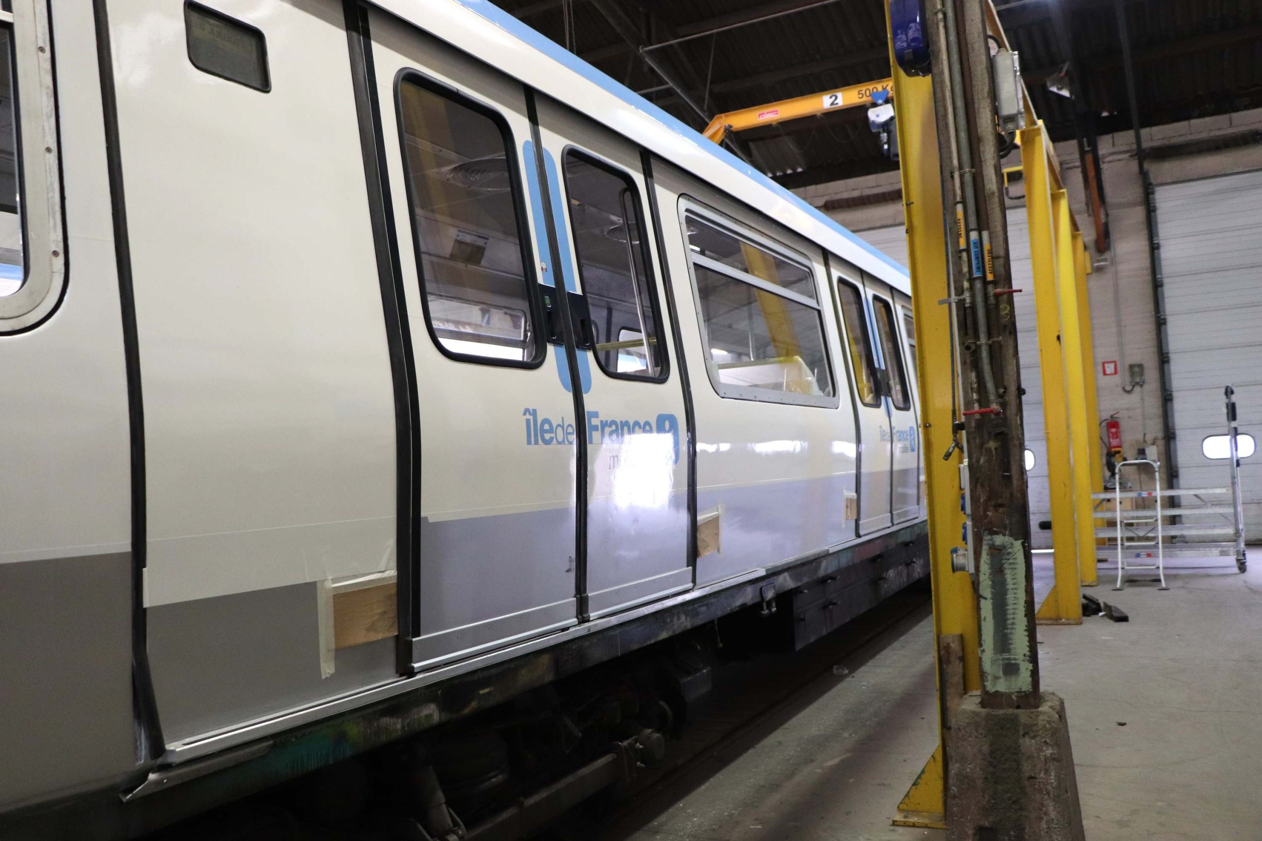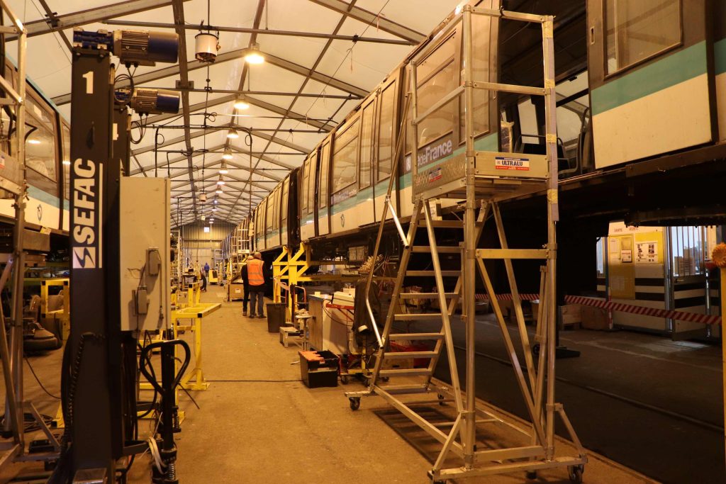 Premier hangar : voici des rames du métro parisien. Ce chantier concerne toutes les rames des lignes 7, 8 et 13 de la RATP. Il a démarré avant le rachat d’ACC-M par son propriétaire actuel en 2019 et s’étend sur près de 8 ans. Et encore concerne-t-il seulement le rajeunissement esthétique et le confort des passagers. On verra plus loin d’autres missions qui peuvent mener beaucoup plus loin. Mais tout de même, ce toilettage va permettre de rouler 10 ans de plus à ces rames de type MF77. Comprenez dans cette dénomination qu’il s’agit de voitures « métro sur fer construites en 1977 ».