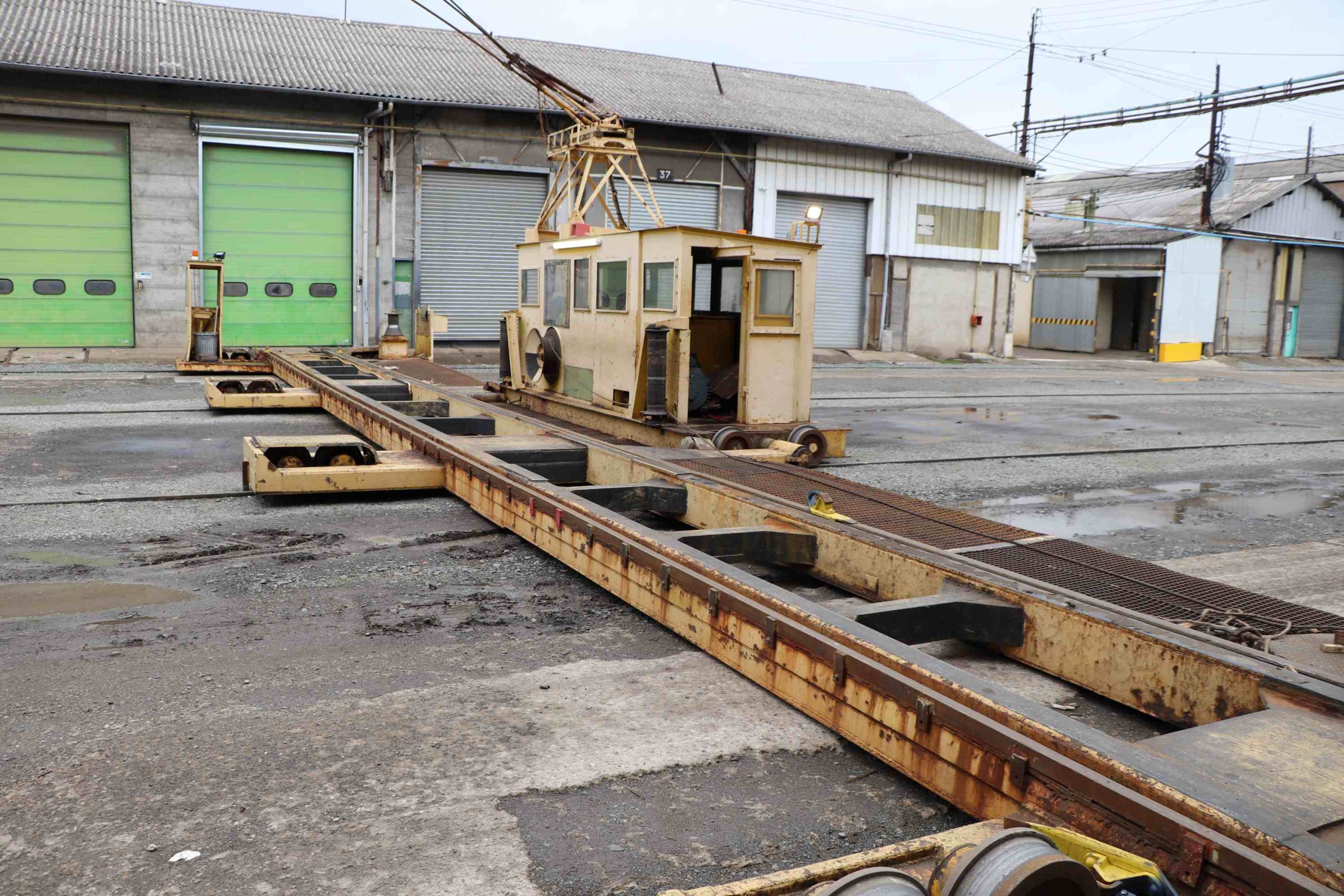 Et pour passer d’un emplacement sous un hangar à un autre ? Voici le transbordeur. Son principe : un rail mobile se déplaçant sur des rails fixes perpendiculaires à ce rail mobile. Sa longueur est équivalente à la largeur entre deux bâtiments, et suffisante pour y charger le matériel à déplacer. Celui-ci est tiré par un câble et placé sur le transbordeur. Le rail mobile est alors déplacé avec son chargement jusqu’à la porte de l’emplacement visé.