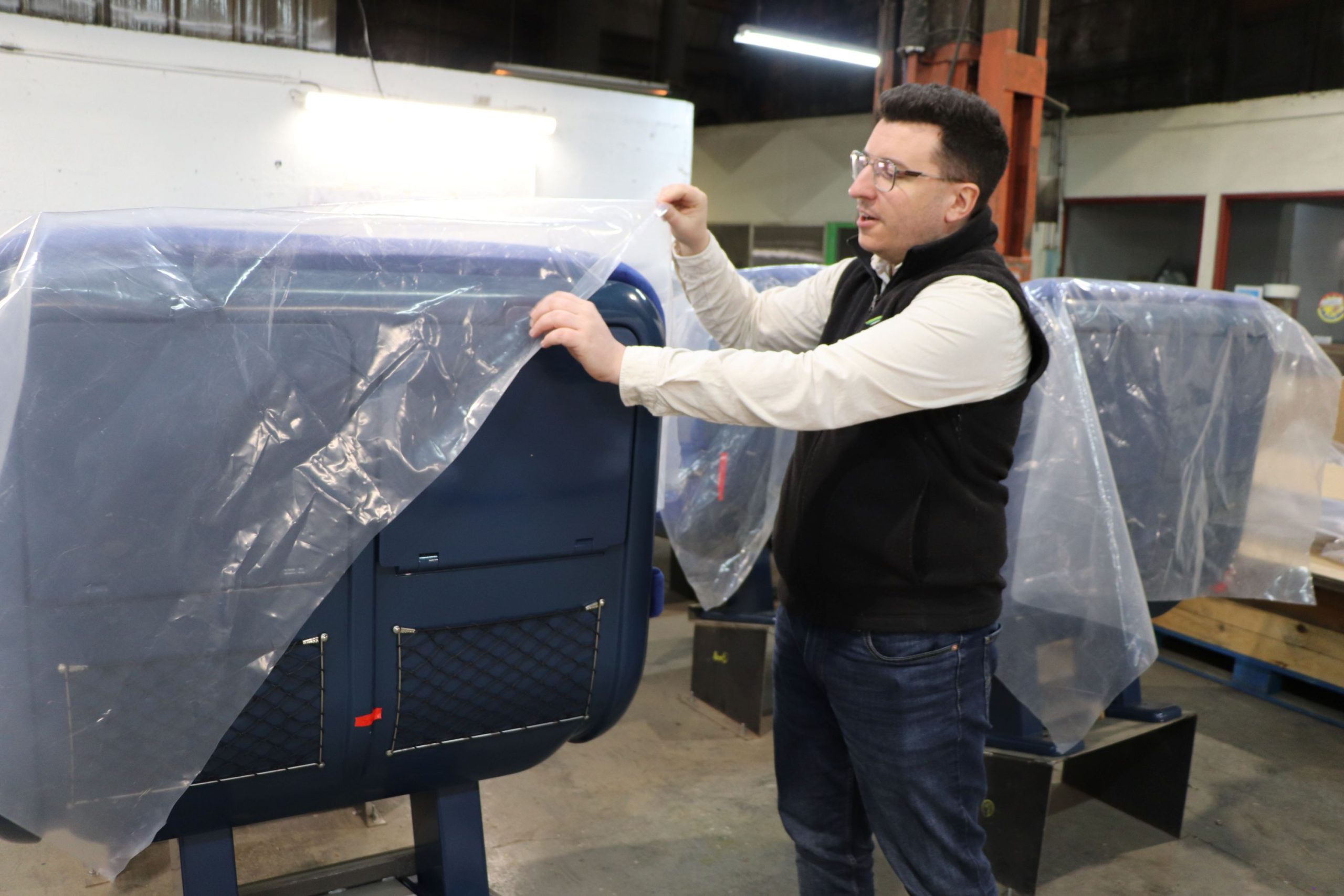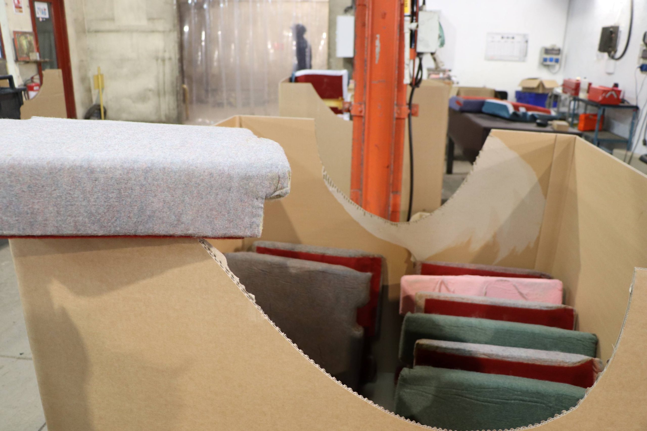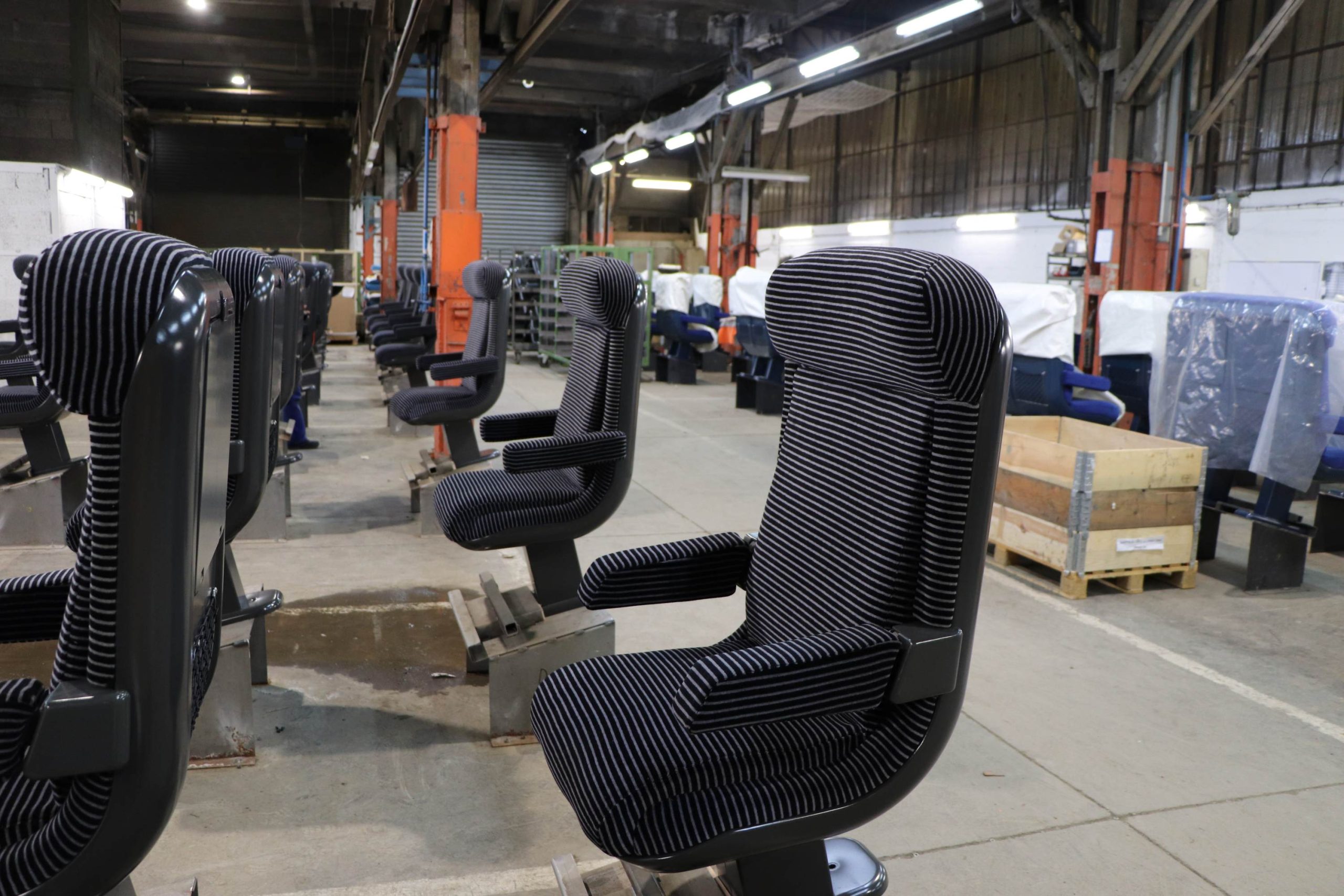 Plus loin, il me montre l’atelier garnissage. Les sièges y sont remis en état. Chaque garniture en mousse est dé-houssée, inspectée, remplacée si besoin, rhabillée souvent avec de nouvelles couleurs. « Nos ‘petites mains’, que j’appelle ainsi en raison de la minutie de leur travail, inspectent le résultat et signalent les petits défauts avec ces rubans adhésifs rouges », montre Loïc, tout en me faisant remarquer les socles sur lesquels sont rehaussés, pour le confort de ceux et celles qui les manipulent, chacun des quelque 80 sièges alignés dans l’atelier.