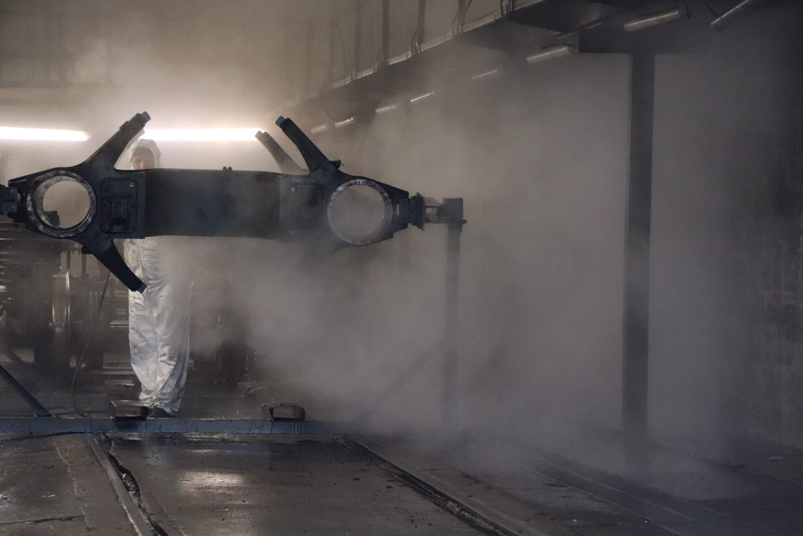 On aperçoit par exemple, en passant devant un petit hangar ouvert, le lessivage puissant des grosses pièces de bogie. Autre hangar, autre ambiance : là on ne verra que l’extérieur d’un très très gros caisson : le sas de désamiantage. « Les rames qu’on reçoit n’ont plus d’amiante en contact avec les passagers depuis longtemps, mais on en trouve encore dans les extérieurs, les peintures, etc. Certains clients font le choix de profiter des maintenances pour enlever ce qui reste. D’autres préfèrent le recouvrir et l’encapsuler jusqu’au moment du démantèlement en fin de vie », explique Loïc.