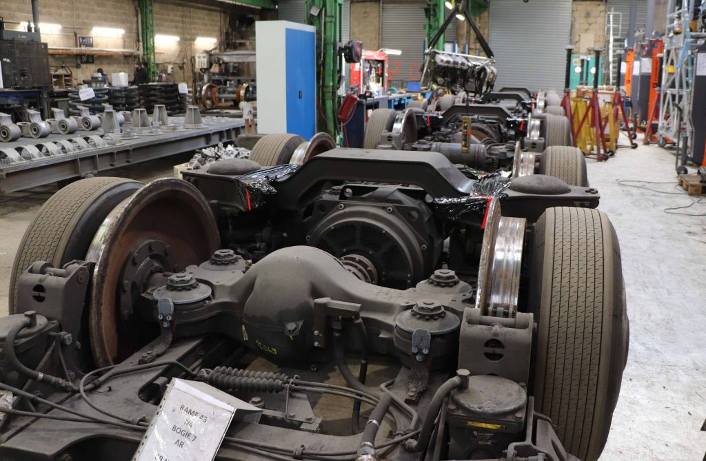 Non loin de là, dans le même hangar, ce sont des bogies qui sont bichonnés. Encore un peu de vocabulaire ferroviaire pour désigner le chariot situé sous le véhicule, avec les essieux et les roues. En l’occurrence, se côtoient ici des bogies de voitures Corail et ceux de MPL75, soit des rames de métro lyonnais sur pneus de 1975.