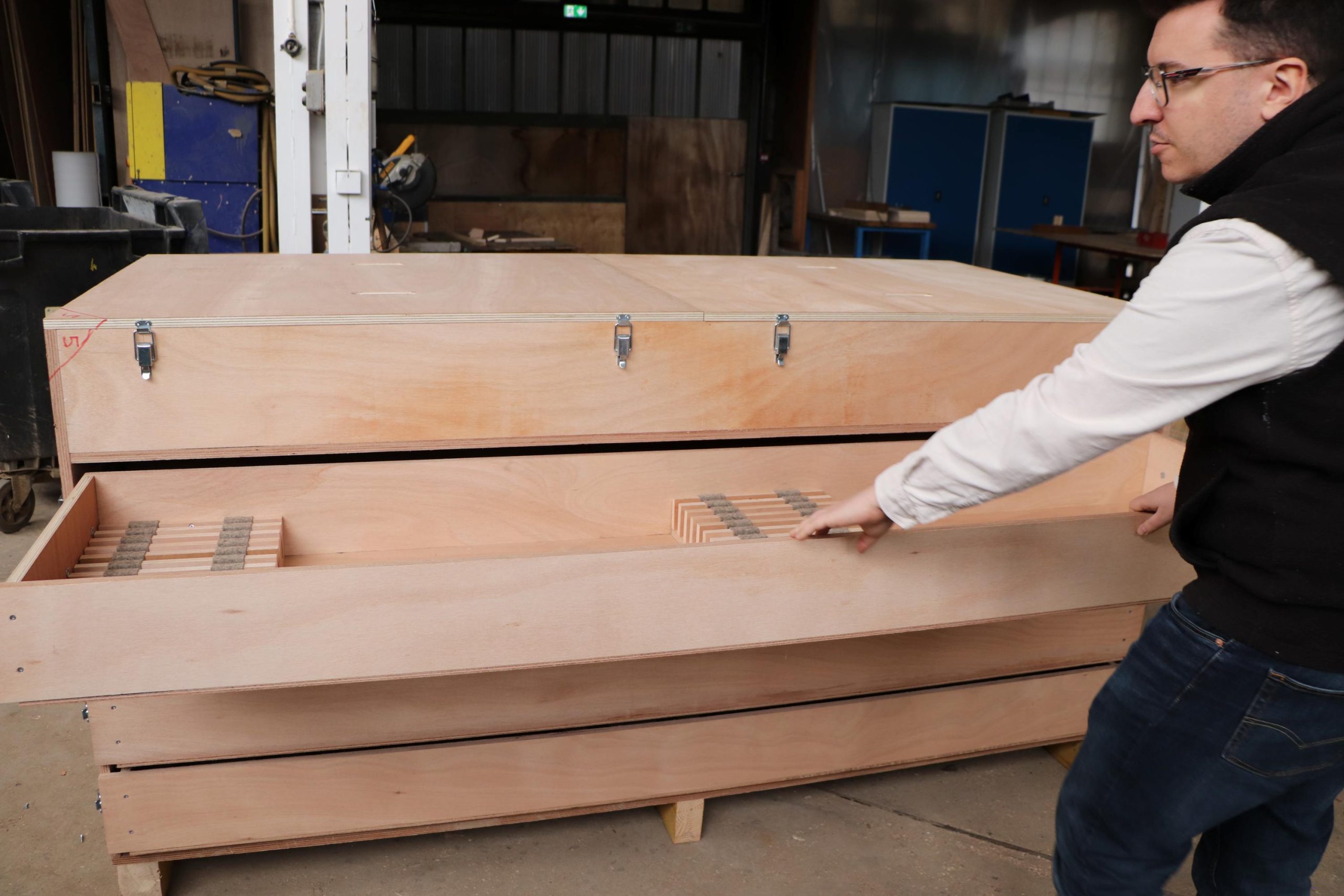Loïc me donne l’exemple d’un coffret contenant 36 emplacements pour loger les pièces métalliques qui permettent d’articuler les accoudoirs des sièges, avec des petits caches pour les cases vides. « Ça a été travaillé en lean management pour optimiser leur transport : on voit tout de suite s’il en manque une, et ça évite de se les faire livrer emballées sous plastique », dit-il. D’autres tiroirs, ailleurs, sont dimensionnés pour d’autres pièces, avec des rembourrages si elles sont fragiles, des roulettes pour les meubles à déplacer, et toutes astuces pour rendre le travail simple, agile, autonome.